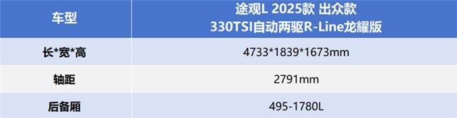 途观L的长宽高为4733*1839*1673mm,轴距为2791mm,在车身尺寸与轴距方面的表现中规中矩。储物方面,途观L的后备厢容积最高可以拓展到1780L,能满足日常出行的基础装载需求。而略显遗憾的是,这款车仅有五座布局,场景适配度欠佳。