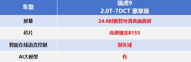 无智能不出行的时代里,孩子要看动画片,老婆要听歌,父母要追短剧… …大家各不相同的需求,意味着车辆必须得有足够丰富的智能配置与交互能力。瑞虎9配有24.6吋极智丝滑真曲面屏,内置高通8155智能芯片,车机反应灵敏,交互流畅丝滑。车机生态丰富,支持CarPlay以及HUAWEI HiCar、车联网、OTA升级、Wi-F热点、手机APP远程功能等配置,可以随时满足全员对娱乐体验的追求。