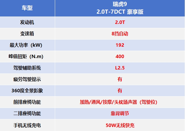 一款车能不能为全员带来畅快与舒适感受,配置是否全面很重要。瑞虎9配有主驾驶加热+通风+按摩+记忆等功能,并且配有头枕扬声器,真正做到了大而舒适。前排手机无线充电,USB、Type-C接口,全员都能尽情娱乐,不用担心电子设备电量告急。另外,这款车还搭载了2.0T发动机与爱信8AT变速箱,最大功率192kW,峰值扭矩400N.m,动力强,操控稳,还支持多种驾驶模式灵活切换,去哪儿玩都能尽兴。主动安全上,瑞虎9全系标配L2.5级智能辅助驾驶,540度影像、DOW开门预警、后方碰撞预警等功能应有尽有,上车就是满满安全感。