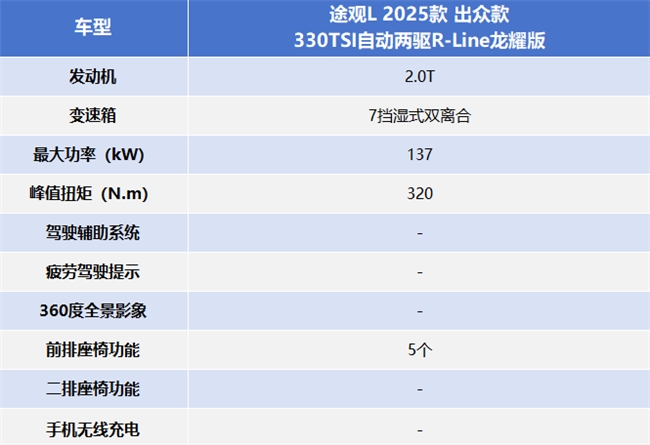 途观L的舒适性配置较为保守,支持前排座椅加热,自动空调等,但并未配备50W手机无线充电,座椅通风、按摩,二排座椅调节等提升便捷、舒适体验的配置。动力配置上,这款车搭载的也是2.0T发动机,动力能够满足日常需求。不过,由于缺乏更丰富的驾驶辅助功能,这款车在智能出行体验方面的表现仍有提升空间。